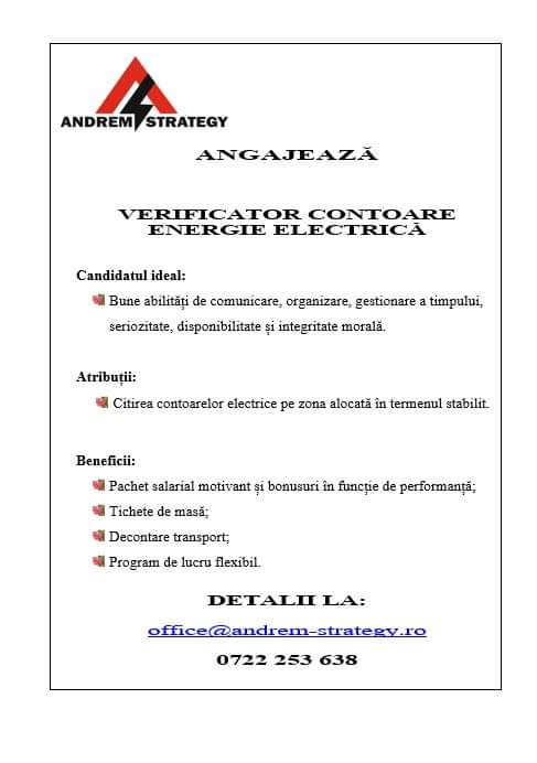 ANDREM STRATEGY angajeaza cititori contoare energie electrica in zona Oltenita si localitatile invecinate.